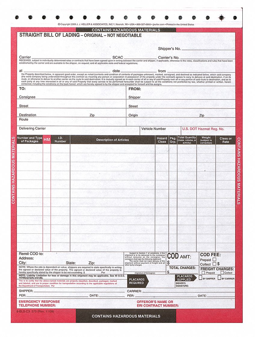 JJ KELLER, Hazmat Bill of Lading Forms 19YK6112463 Grainger